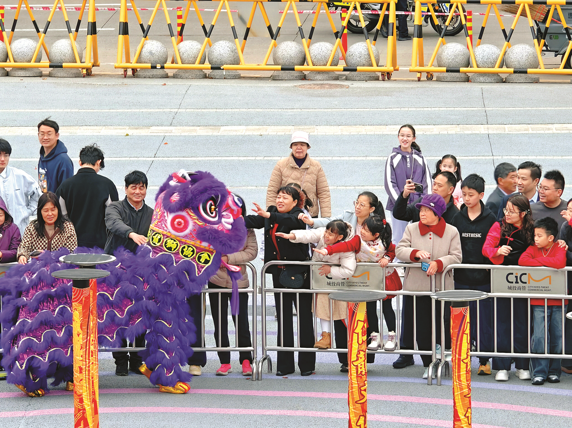 人群中,身穿红色衣服的市民陈先生一家格外引人注目,他抱着女儿看醒狮表演,脸上洋溢着幸福的笑容。“大年初一带着妻女来儿童公园看醒狮,感觉特别有新年的氛围!”陈先生表示,得知市儿童公园有醒狮活动后,特意带女儿来摸摸狮头,沾沾喜气,近距离感受醒狮文化的魅力。