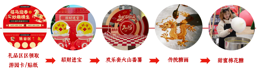 游客可在礼品区可领取马年游园卡一张和领取活动贴纸,凭活动券参与游园冲关活动,游戏的趣味性+传统糖画的体验感和消费的获得感紧密结合,把新春福气和甜蜜一起带回家!