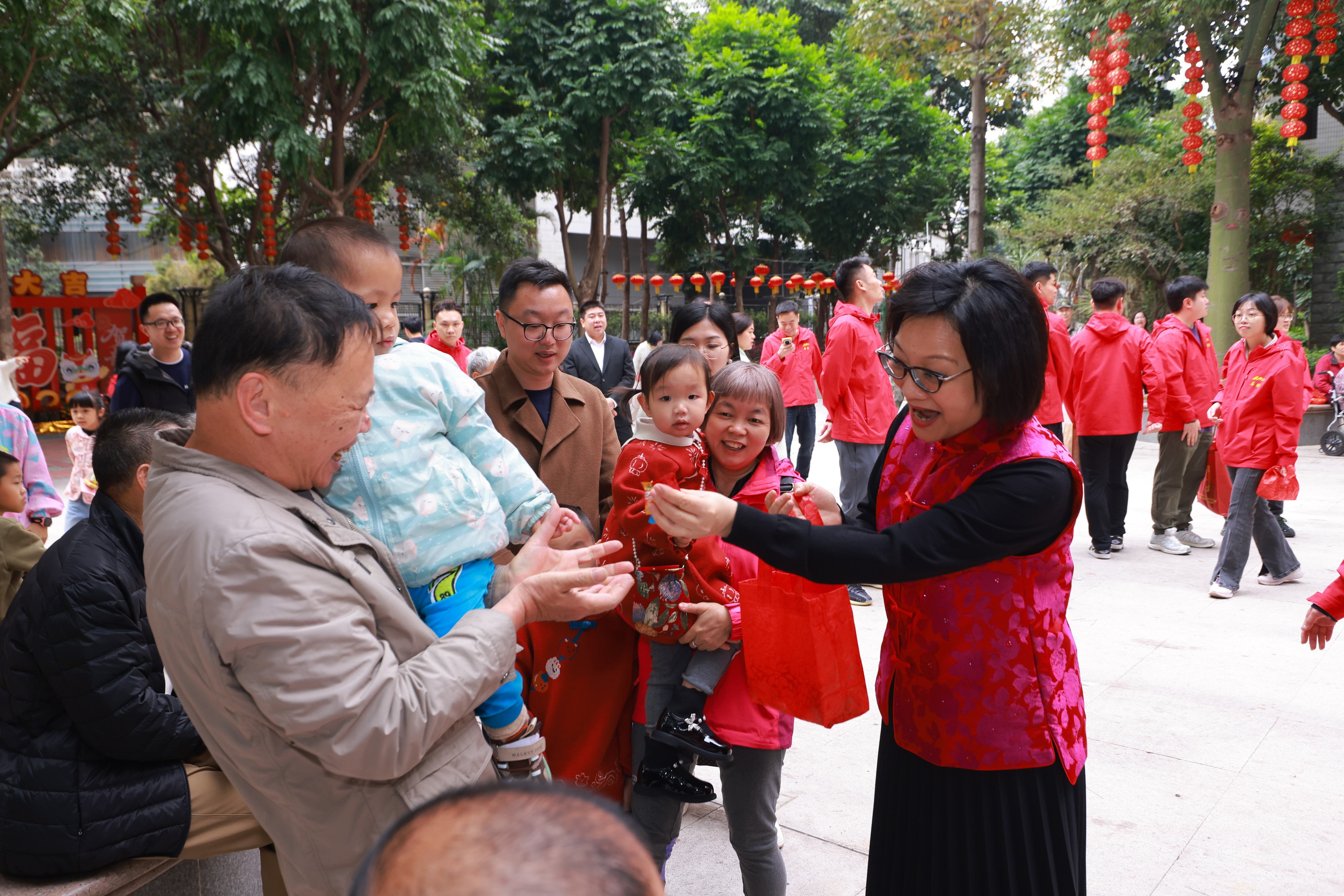 随后,集团领导班子身着喜庆服饰,前往曲艺阵地团拜,沿途派发糖果,将甜蜜祝福传递给每一位市民。