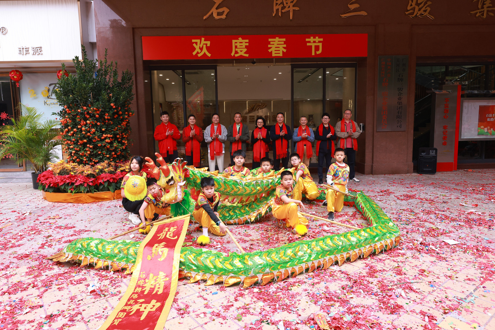 上午8:30,礼炮轰鸣,迎狮仪式开启,锣鼓声、欢呼声交织成新春序曲。礼炮声落,各醒狮队轮番会狮,狮头轻点、摆尾腾跃,灵动俏皮。随后,石牌三骏企业集团领导班子在公司大门团拜,一句句诚挚祝福,传递企业担当与新春暖意。